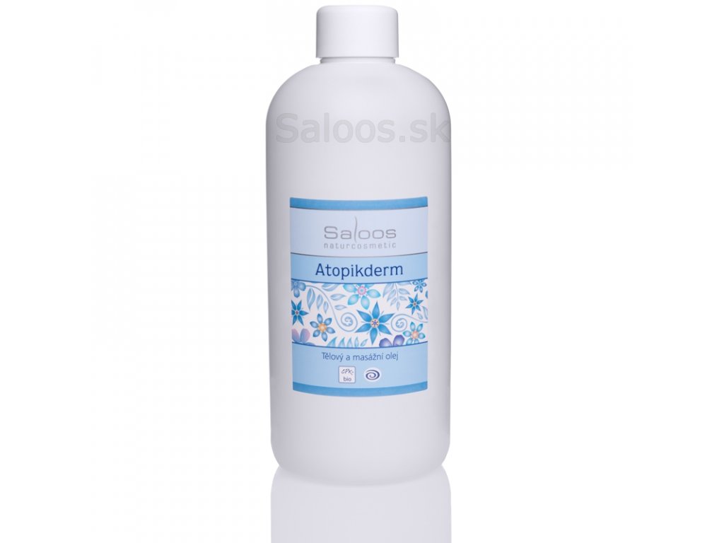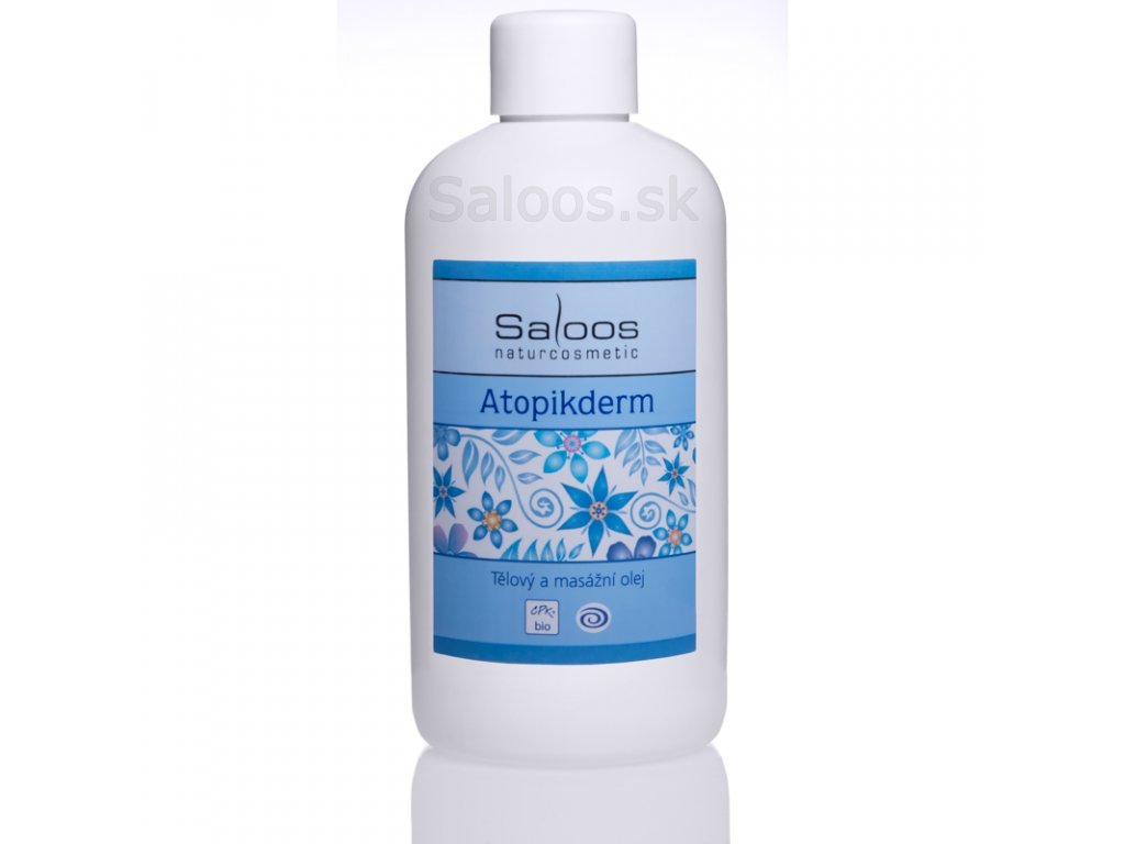 Keď si koža nevie rady! Masážny olej Atopkderm pôsobí protizápalovo a zmierňuje silné svrbenie a začervenanie kože. Zabezpečuje ideálnu starostlivosť a výživu kože postihnutej ekzémom, psoriázou alebo vyrážkami nielen pri akútnych problémoch, ale aj v kľudovom období, keď je potrebné pokračovať v starostlivosti a tým predchádzať ďalším ťažkostiam. Vďaka viacnenasýtenej mastnej kyseline gamalinolénovej (Pupalkový a Borákový olej) je tento masážny olej vynikajúci na regeneráciu precitlivenej, suchej a namáhanej pokožky. Zloženie: Oleje Saloos lisované za studena: